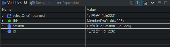 session.selectOne ๋ฉ์๋๋ฅผ ์ด์ฉํ์ฌ ์ฟผ๋ฆฌ๋ฌธ์ ํด๋นํ๋ id ๊ฐ์ ๊ฐ์ ธ์ต๋๋ค. ์ด๋ xml์์ ํด๋น id์ ๋ํ resultType์ ๋ฐ์ดํฐํ์ด ์๋ก ๊ฐ์์ผํฉ๋๋ค. id๋ String์ด๋ฏ๋ก ๋๋ค String์ผ๋ก ํด์ค๋๋ค.